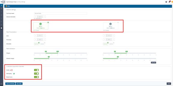 When you add a foreign currency under Your Currencies for the first time, you will be able to configure various items such as the rate of precision, the number of units, number of decimal places and the direction (normal or inverse). You can choose whether to enable, or even disable certain BUY and SELL rates, so they do not appear on rateboards and other directories. When the BUY rate is highlighted in green, it means that it is enabled, while a grey SELL rate as seen in the example below means that it is disabled.